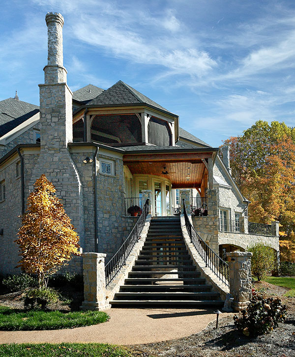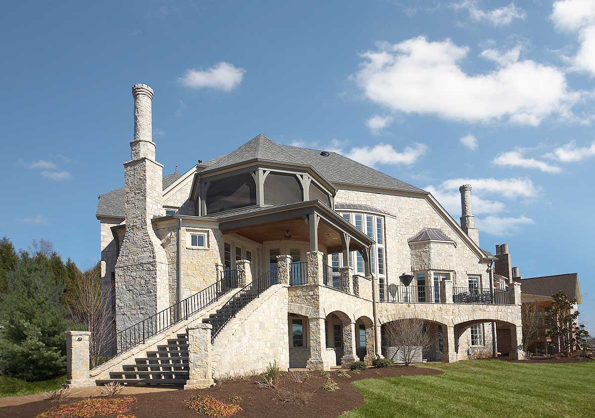 Custom home featuring stone exterior, custom woodwork throughout, and multiple outdoor living spaces.