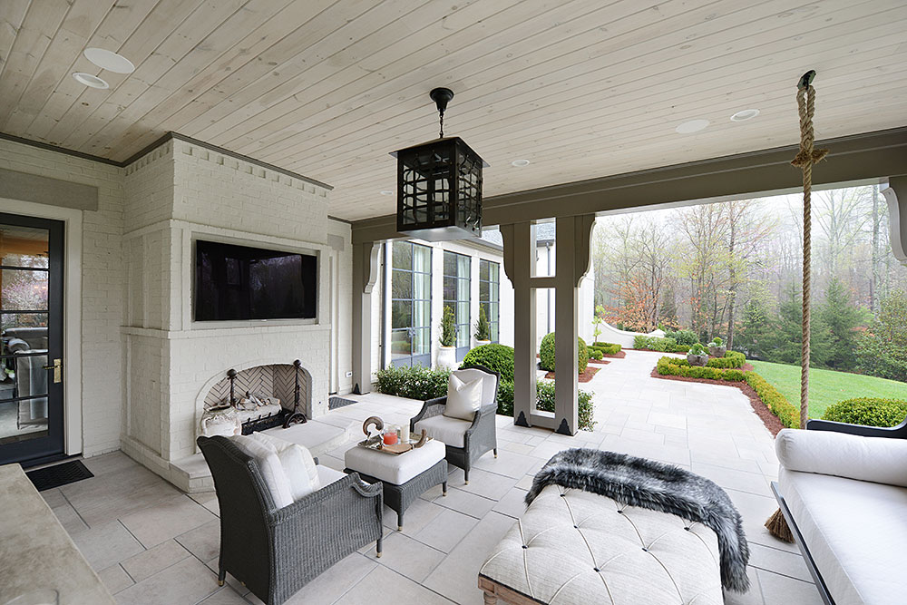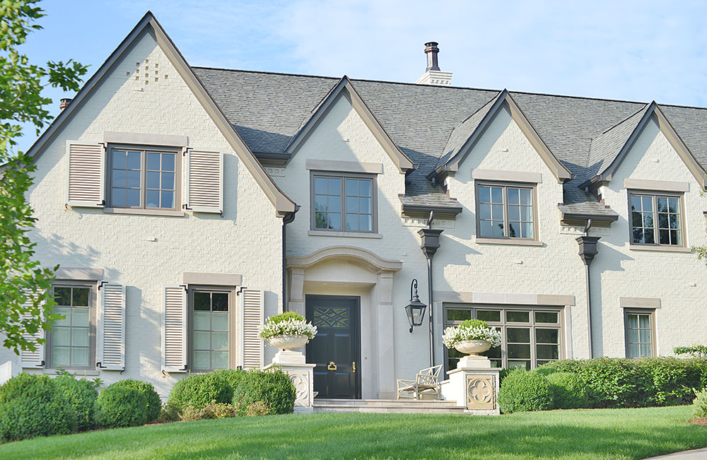New construction featuring painted brick, limestone, exposed timbers, gas lanterns, and custom louvred shutters and walls.